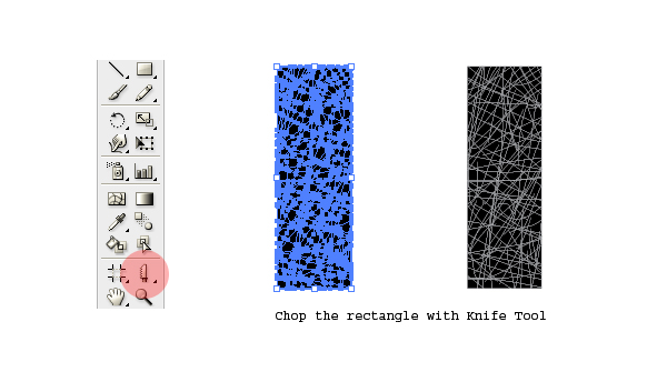 Grab the Knife Tool from the Tools palette and chop the rectangle in zigzag, up-down, left-right and any possible way (this is a freestyle step). Make sure you don't leave any big part un-chopped. Our aim is to create a large number of tiny elements that are different in size and shape. The result should look something like the image below.