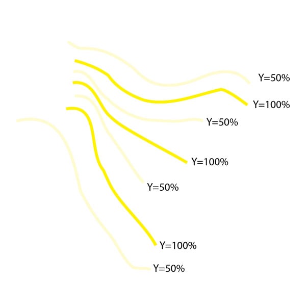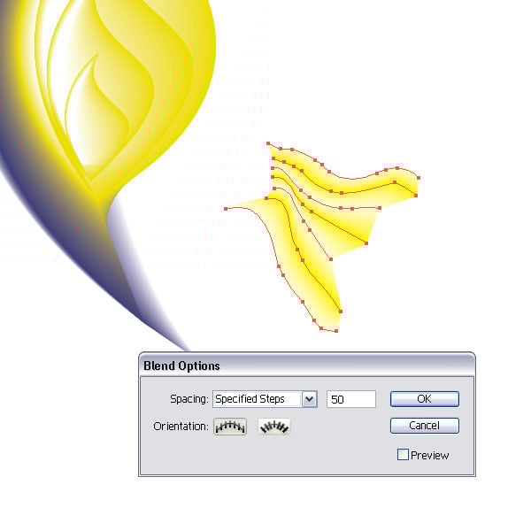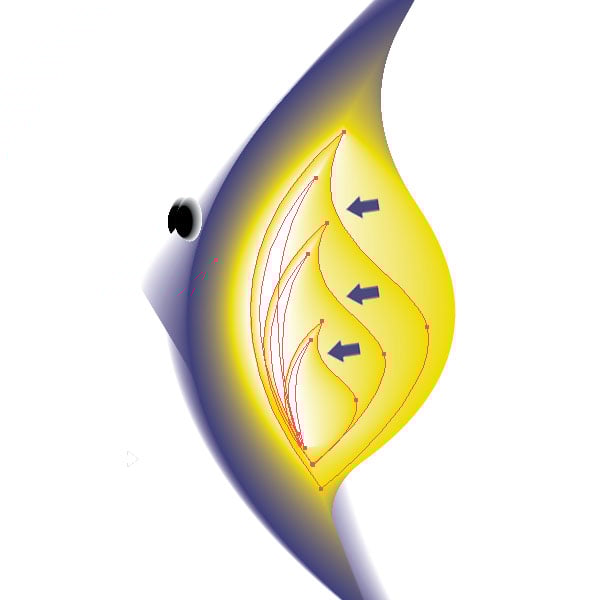 Next, we will be creating some fins. Draw some lines with the Pen Tool (P). I made about seven of them. Set the Stroke to at least 0.25pt. Then add a yellow Stroke color. Offset the color though, making one line 100% yellow, the other 50% yellow.