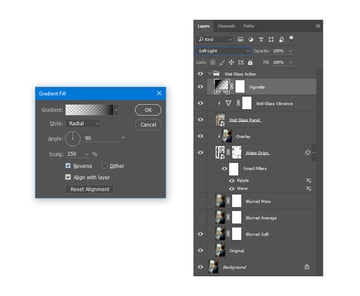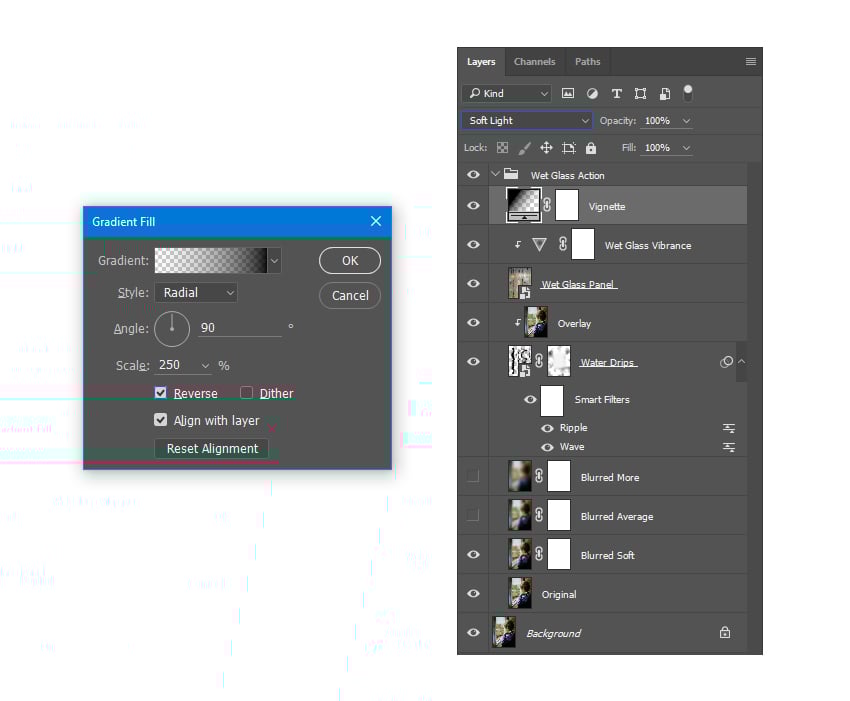 Now, select the Wet Glass Vibrance layer and go to Layer > New Fill Layer > Gradient.... Name it Vignette and click OK.