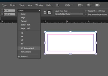 Now repeat Step 3 for the business cards. This time you'll create two duplicate pages. One for the front and one for the back of the business card. Instead of inputting the width and height, select the Custom drop down and go to US Business Card. This will format your page to the standard 3.5 x 2 in business card size. If you have a different business card size, you can input it exactly like you did for the envelope in Step 3.