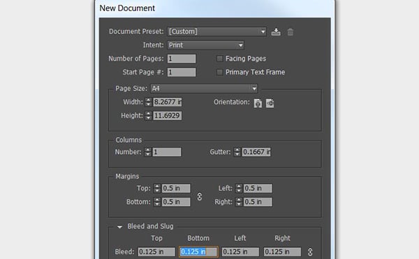 The first item I create in my letterhead workflow is the main letter. The size of this document is a classic A4 size. Open InDesign and select File > New Document to create your first item. Set Intent to Print and Number of Pages to 1 (we'll add more later). Deselect Facing Pages. Under Page Size select A4. Set the Bleed to .125 in on all 4 sides.