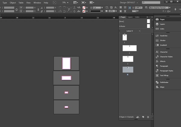 You end up with an InDesign document that has four different sized pages. One for the letter, one for the envelope and two for the business card. If you Zoom Out, you'll notice that the page sizes are different in the Workspace as well as the Pages Panel. This will help you see what page is what in your letterhead workflow.