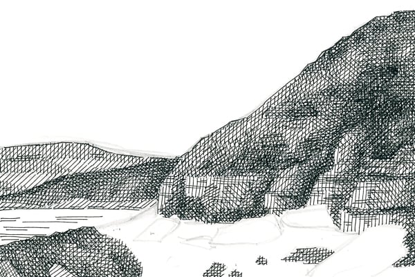 You've just inked your first crosshatched landscape! After a few pictures, you'll start to get a better feel of which way your lines should go to better embody the landscape. There's no right or wrong way to ink your lines so long as you have a wide range of value in the end. Crosshatched landscapes make great vacation activities as it gives you an excuse to sit on the beach longer.