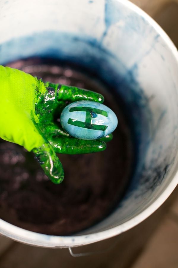 I highly recommend wearing high-quality large kitchen gloves - not the ones that come in the indigo dye package - for dipping the eggs. A lesson I learned after sporting a blue Smurf-like hand for several days!