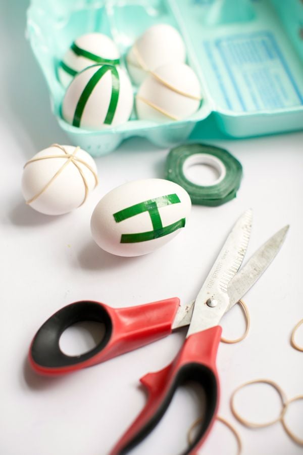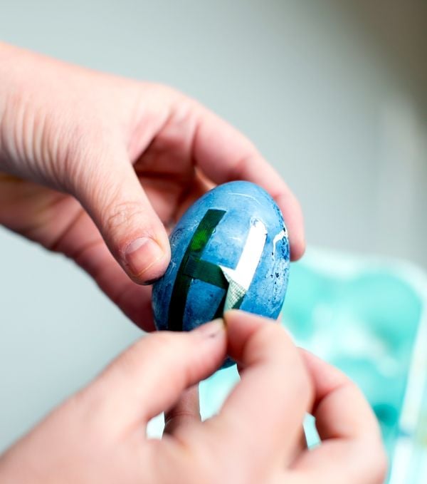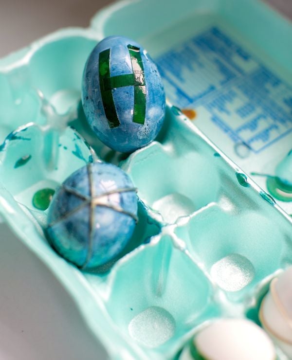 Use tape, rubber bands, stickers or even wax to create shapes and patterns on the eggs. These will resist the dye. Tape will create more distinct lines while rubber bands tend to move around and make beautifully blurred marks.
