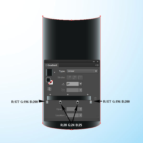 Copy the shape from the previous step with Command + C then paste with Command + F, delete the Gaussian Blur from the Appearance panel then reduce the Stroke to 1px and fill with a Linear gradient as shown in the picture below: