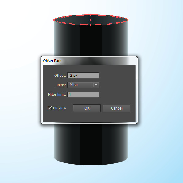 As the shape from the previous step that you filled with a Linear gradient is selected go to Object > Path > Offset Path. Set the Offset to -2px, click Ok and change the color of the shape that appeared after applying Offset to R:35 G:31 B:32.