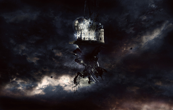 The next step is one of the most important - the main focal point. I've put my castle stock in right where I said it would be. Notice how my line objects stick out perfectly and my moon and 3D object fit just behind the castle. This is how your image needs to look. Remember, I used a castle, but if you are not going for a realistic image you can use pretty much anything (such as: a city, building, car, airplane).