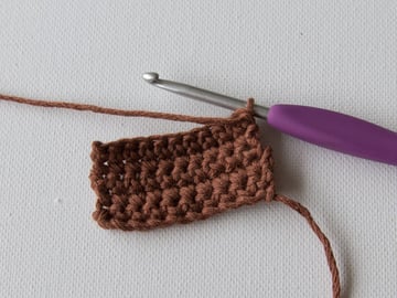 Work 1sc[dc] into each chain. You now have ten single crochet[dc] stitches. Work 1sc[dc] into each stitch back and forth for six rows. Cut the yarn but leave a long tail; we're going to use it to sew the piece together.