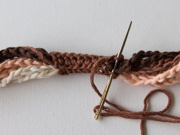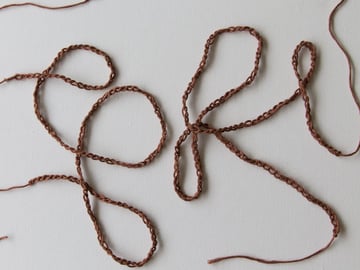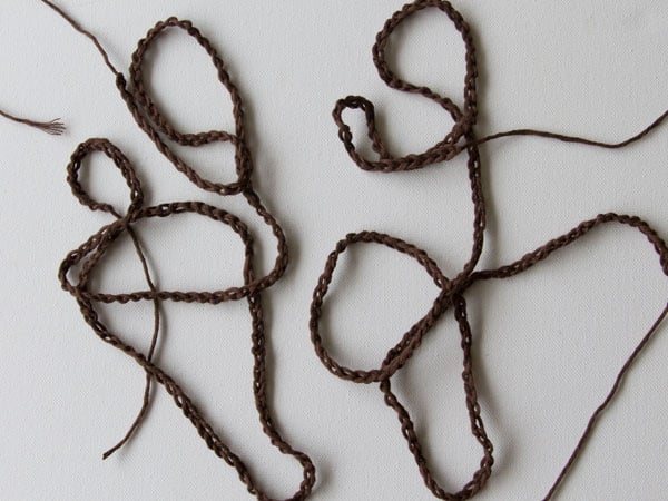 With brown, chain 140. Cut the yarn and pull through the loop on your hook. Make two identical chains.