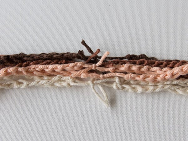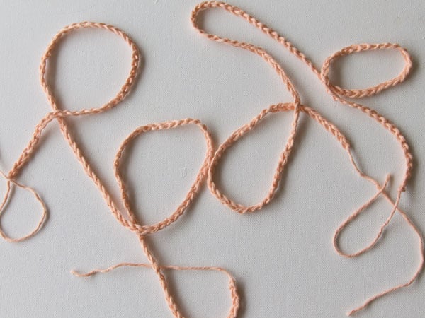 With peach, chain 120. Cut the yarn and pull through the loop on your hook. Make two identical chains.