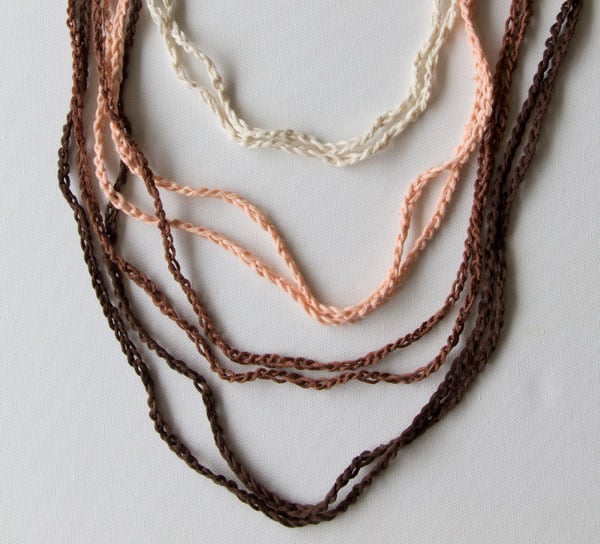With the ever-so-versatile chain stitch, learn how to make this stunning ombre look crochet necklace! If you’ve always wanted to learn how to crochet, follow our series of Crochet Fundamentals. This tutorial uses U.S. crochet terminology, with the Australian and U.K. term in brackets. Stitches include chain (ch)[ch] and single crochet (sc)[dc].