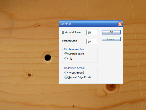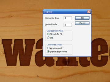 Now back on the main file, duplicate the Wanted text. Rasterize one copy by going to Layer > Rasterize > Type. Then set the other non-rasterized layer to 40% Fill. Then switch it off for the time being so it doesn't get in the way. Now back to the rasterized version, go to Filter > Distort > Displace and use values of 5 and 5 for the scale as shown below. Press OK and then it will ask you what file to use as the displacement map, choose Displacement.psd from the previous step.