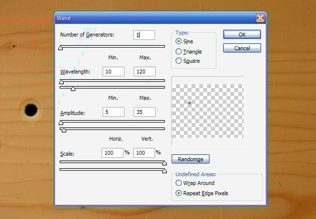 Next, we select the back layer and apple a Filters > Distort > Wave transform. You may need to fiddle with the settings, as you don't want to distort it too much. I've never fully understood the wave tool, I just move sliders around and press Randomize a lot until I get the look I want ... makes you wonder if I should be teaching Photoshop really :-)