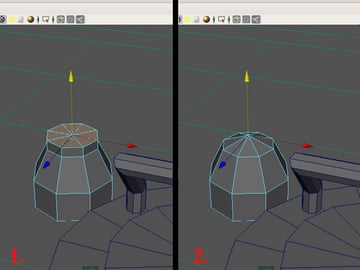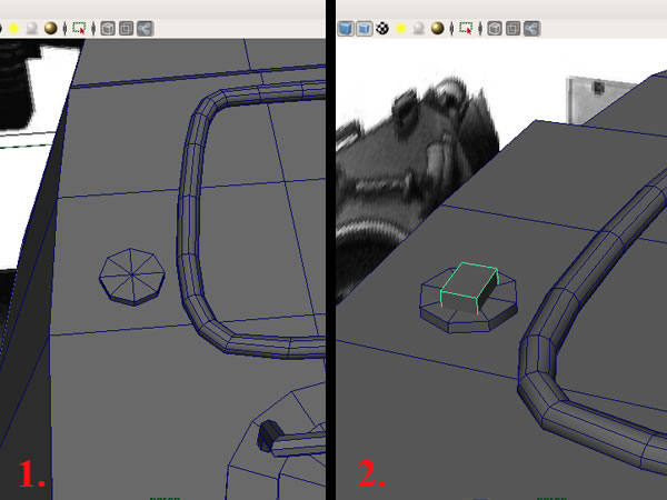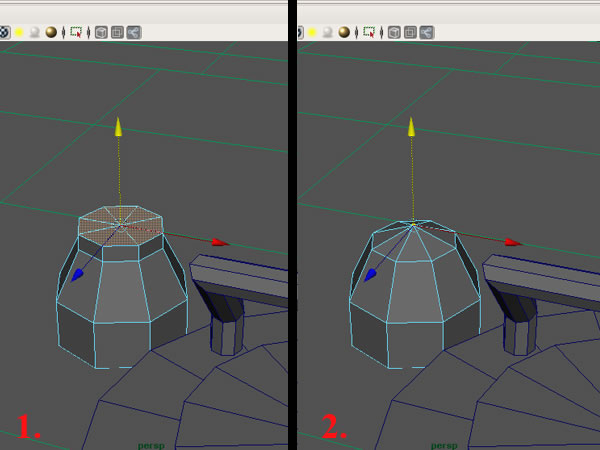 Now create another "Cylinder" with 8 sides (near the left lid) and extrude the top faces, then merge the faces to the center as shown.