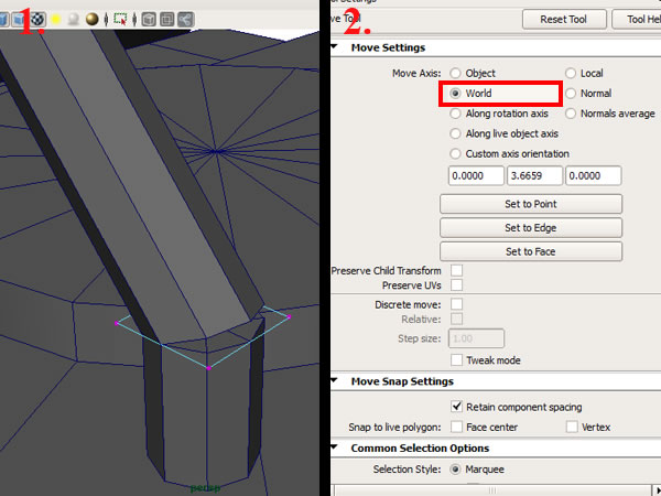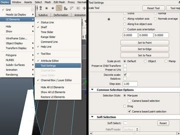A square shaped deformer will appear over the selected vertices, you can go to it's "Lattice Point" mode by using the same right Click HOLD method as before, and choosing "Lattice Point". In order to move any lattice points, go to the movement options "Display>UI Elements>Tool Settings" while using the movement tool. Select "Move Axis to World".