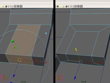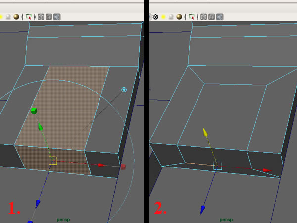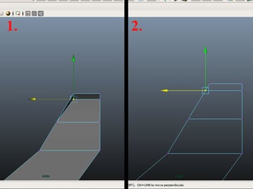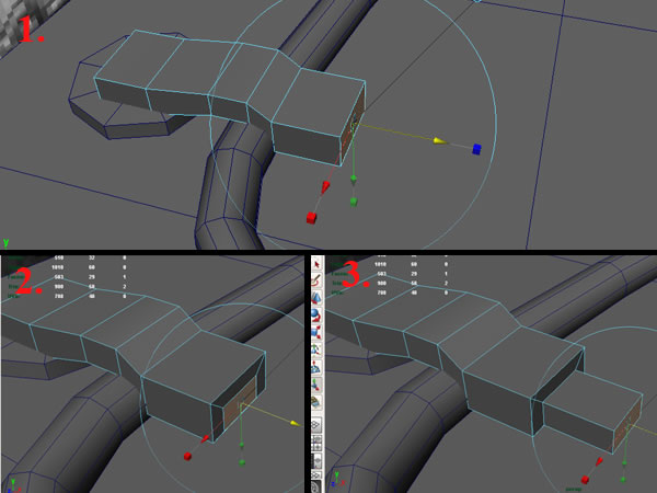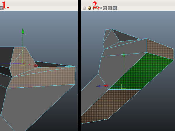Now select the 2 faces shown below and extrude, then scale them in the X-axis. Select the edges and move them to get this shape.