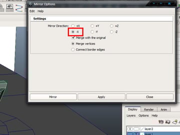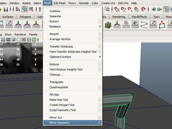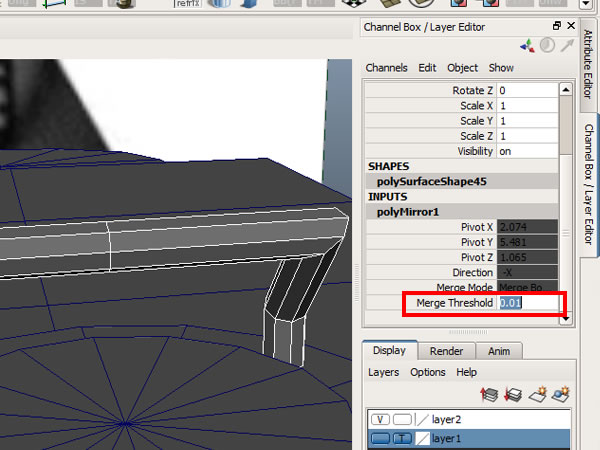 Now because of a threshold issue, all your mirrored geometry's close vertices will be merged together. To overcome this problem go into the "Channel Box/Layer Editor>INPUTS>polymirror1" and change the "Merge Threshold" to 0.01.