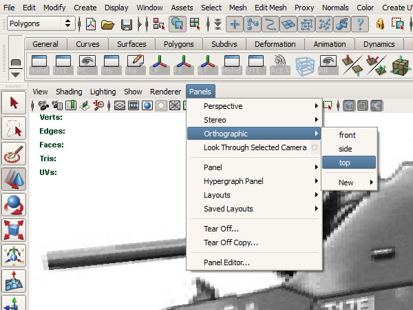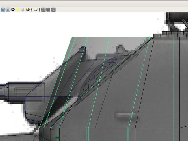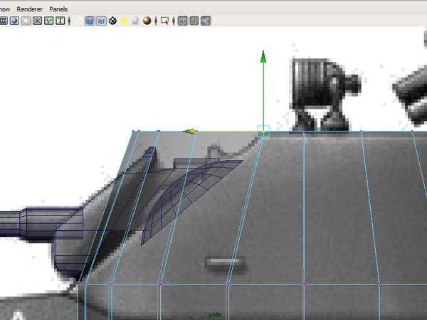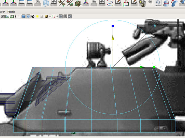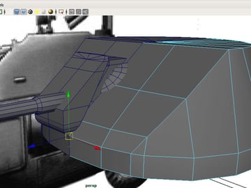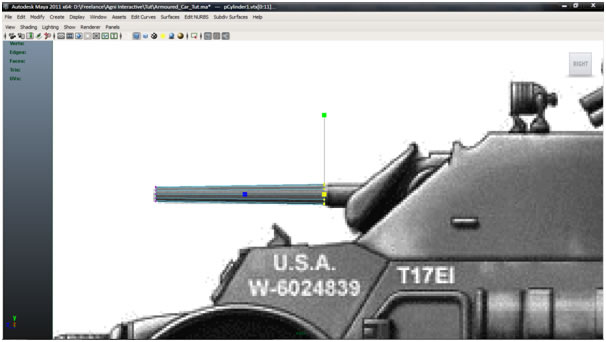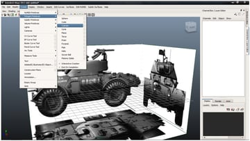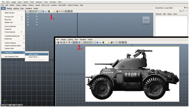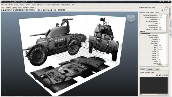 Now that we have made sure that our blueprints are matched correctly in photoshop, our second task is to use these as image planes in the Maya viewports. Open the Four-View layout, and in the Side view go to "View>Image Plane>Import Image”, and import the ‘Armored Car Side’ image.