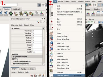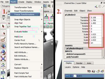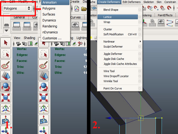 Now go to the "Polygon" tab and change it to "Animation". Then select the top vertices of the lower cylinder and go to "Create Deformer>Lattice".