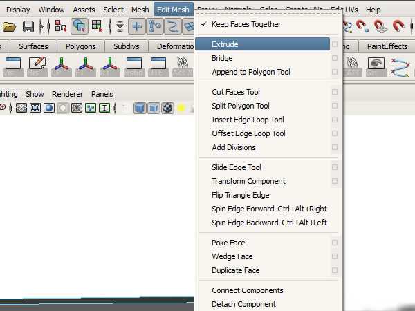 Now go to "Edit Mesh>Extrude". When using extrude make sure the option "Keep Faces Together" is ticked on, this will keep all the extruded faces together.