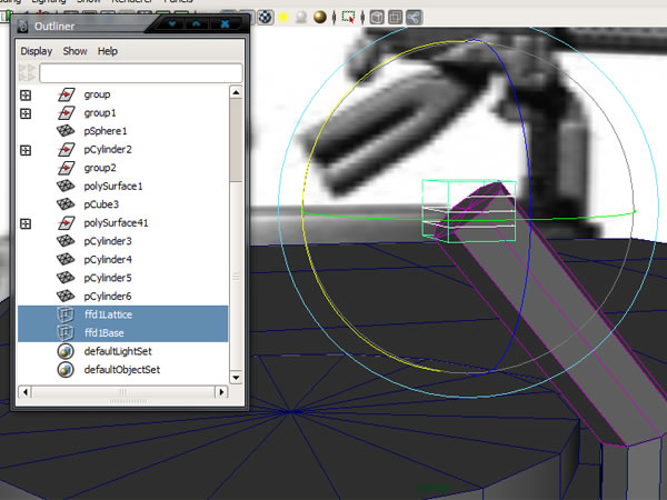Now in the Outliner select "ffd1Lattice & ffd1Base".
