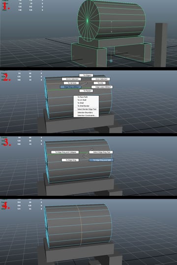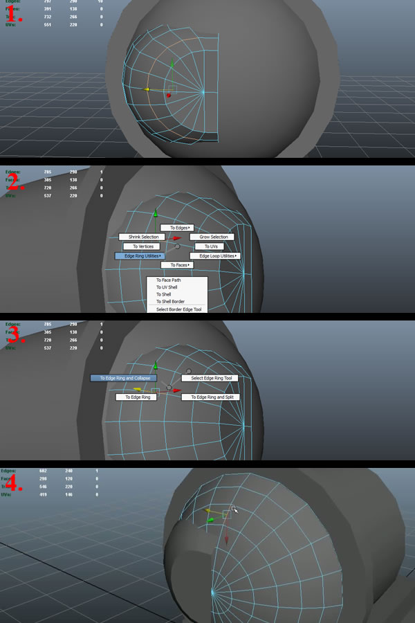Now select the 2nd edge loop, except for the upper and lower edge (as shown) (1), and move it out a bit in the "X-axis". Then select the 3rd edge on the flat surface and press and hold "Ctrl+Right Mouse Button". Move over to the "Edge Ring Utilities" (2) while still holding the "Right Mouse Button". This will popup another set of sub-options. Move over to "To Edge Ring and Collapse" (3) and release the "Right Mouse Button". The whole ring will be collapsed, as we don't need that many polys there. Now select the bigger Sphere and in "Edge selection" mode, select the middle edge and repeat the same process to collapse that ring too (4).