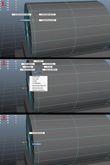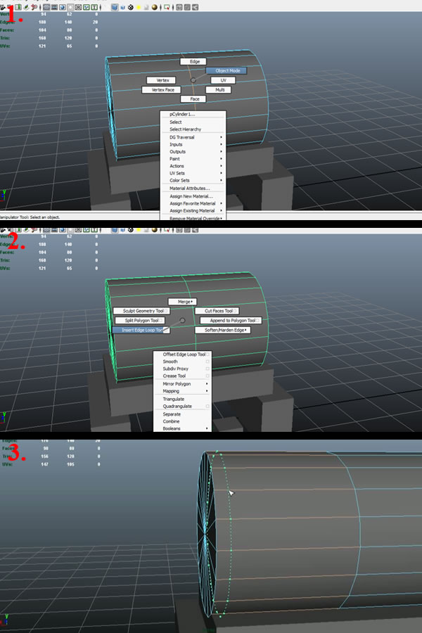Now go back to "Object Mode" by holding down the "Right Mouse Button" and selecting "Object Mode" (1). Then select the cylinder, press "Shift"+ "Right Mouse Button", hold and move over to "Insert Edge Loop Tool" (2), then click on one of the horizontal edges near the corner edge loop, and it will draw a new edge loop as shown (3).