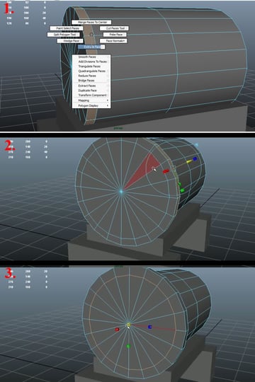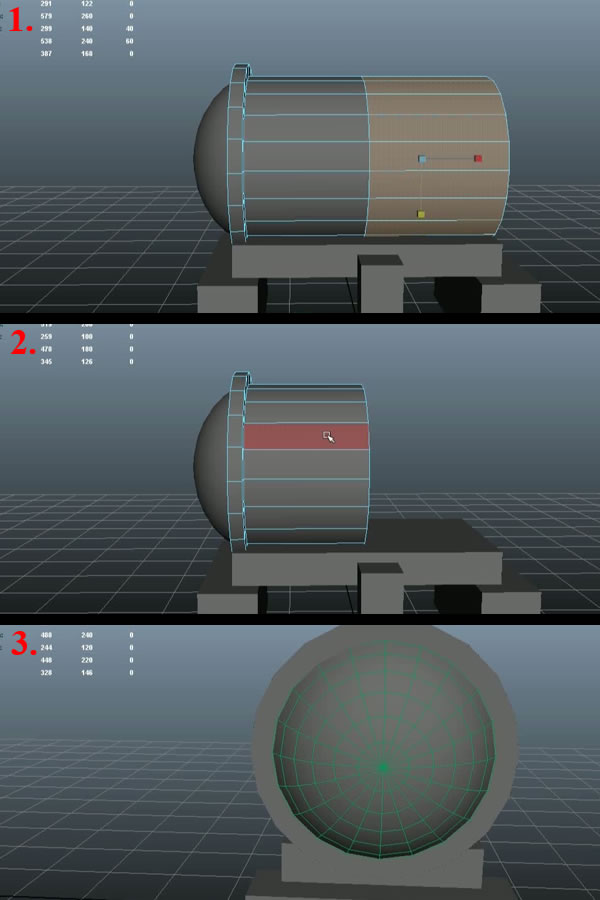 Now select the other half of the faces of the Cylinder (while in "Face" selection mode)(1) and delete it (2), as we'll mirror the whole thing when done. Next select the Sphere and make it live by using the same "Make Live" option (3).