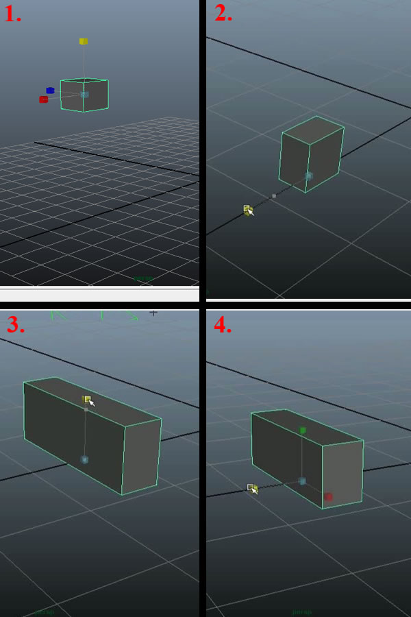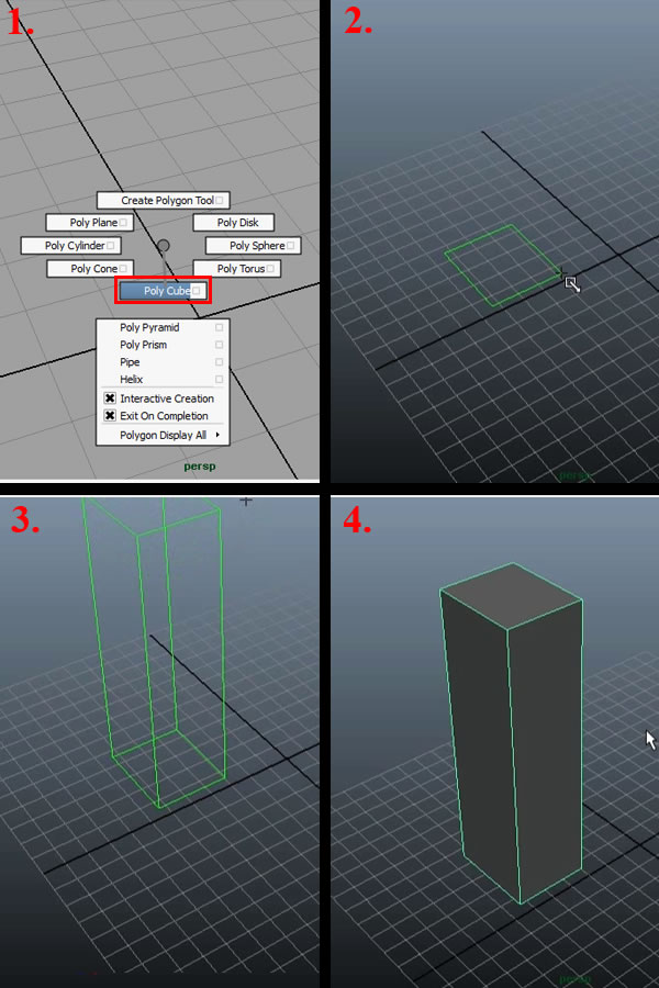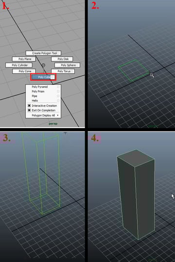 We'll start our model with a "Poly Cube", now in this tut I'll be mostly using the "Maya Hotbox (pop-up) Controls" and will also be explaining them. So to create a "Poly Cube" (or any other polygon shape,) press and hold down the "Shift Key", and then Right-Click (and Hold) in the viewport. In the Options box that pops up, drag the cursor over to "Poly Cube" (1) and release the "Right Mouse Button ". This will give you a new cursor marker with a + sign over it, and now you can drag and draw your polygon cube shape as you want it. First draw the base (2) and then drag again to complete the shape (3-4).