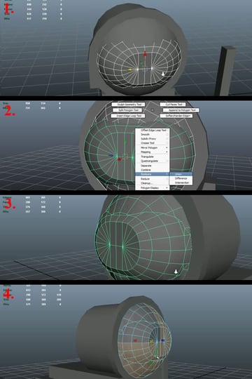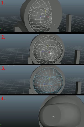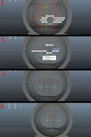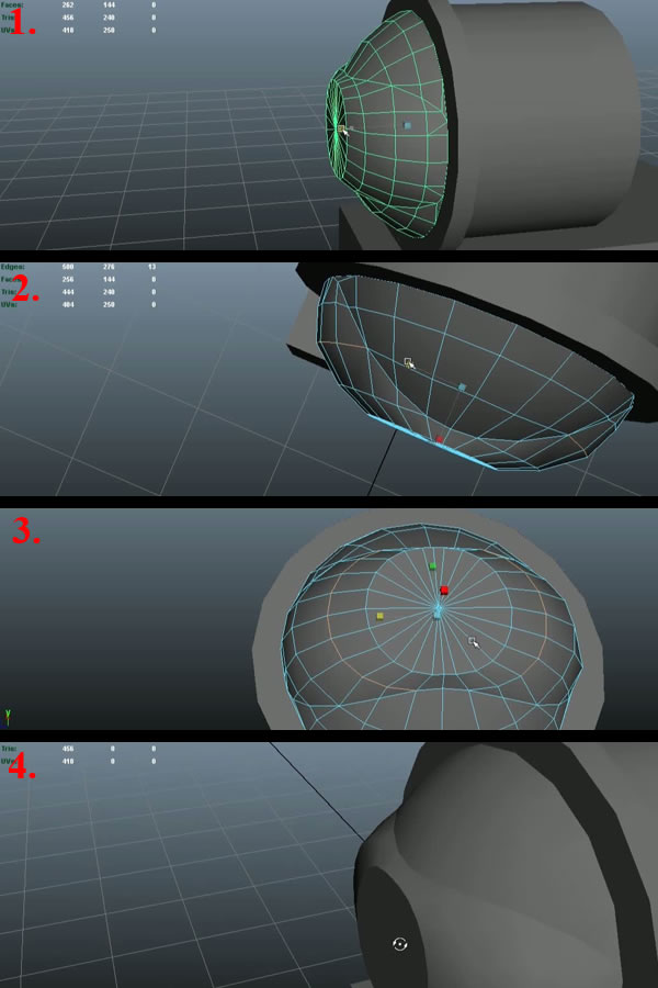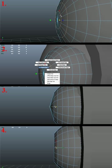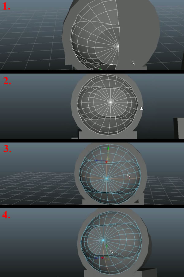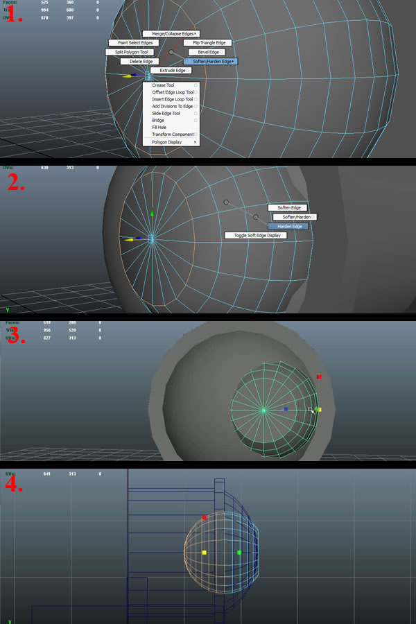 Now select the first edge loop by double clicking over any edge, and pressing "Shift+Right Mouse Button ", hold and move over to "Soften\Harden Edges" while still holding the "Right Mouse Button" (1). This will popup another set of sub-options, move over to "Harden Edge" and release the "Right Mouse Button" (2). You'll notice the new hard edge. Now scale the Sphere up a bit (3) and go to Face Selection Mode, select the faces on the back half of the Sphere and delete them (4).