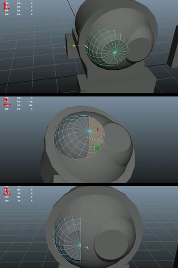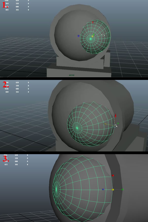 Now Duplicate the Sphere and change it's pivot to the other end vertex, and snap align it to the left center vertex of the bigger Sphere (1). Now select the faces on the right half of this Sphere and delete them (2)(3).
