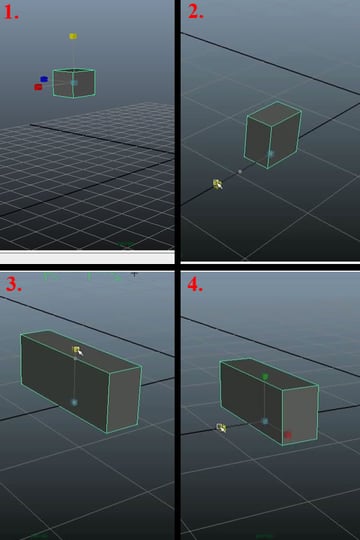 Now using the "Move Tool" (W) and the "Scale Tool" (R) , move the cube to the grid (1-2), and scale it to match the shape of the base as it's shown in the reference image (3-4). As you can see in image 2, the pivot has changed from the center to the bottom, so to correct this, just hold down the "D" and "V" keys (together) and drag the Pivot to the bottom, and it will snap align the Pivot to the lowest vertex. "D" is the hotkey to "Move Pivot", and "V" is to "Snap Vertex".