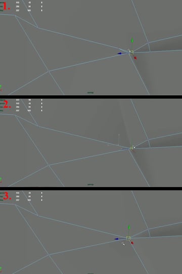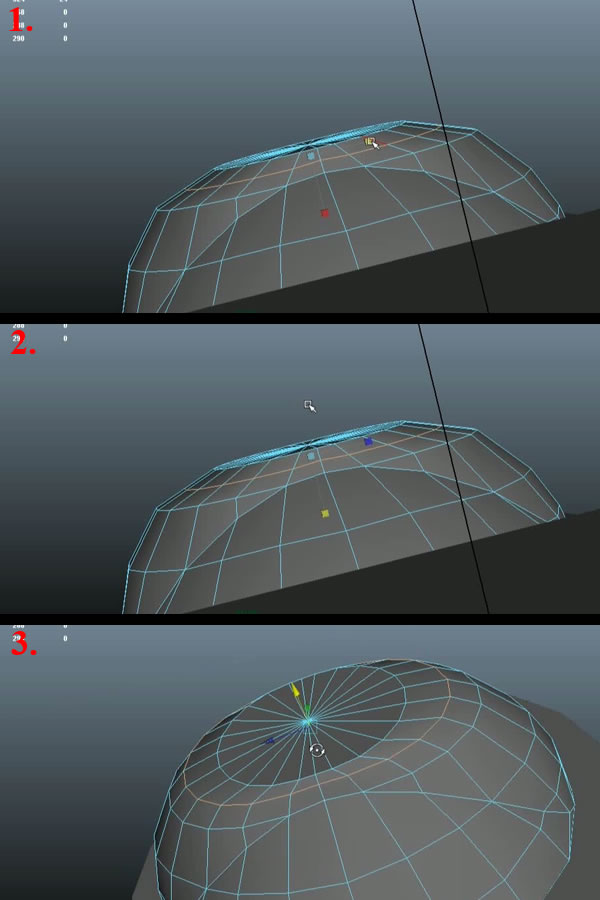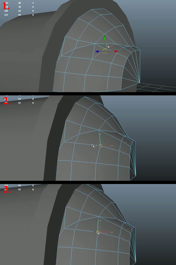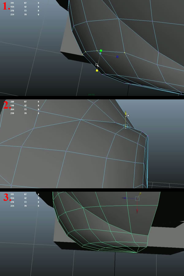 Now first the reason for leaving only the upper quarter of the whole geometry is because, as all of you have probably noticed. It's actually symmetrical on all 4 quarters, so we can work and improve only one quarter of it. (then mirror it twice in the "X" and "Y" axis, once we are satisfied with our geometry). This will save us a lot of time as well. Now to start cleaning up the mesh, select the open vertices (1) and start snapping them to the closer ones, using"V" and the "Middle Mouse Button" while dragging (2-3).