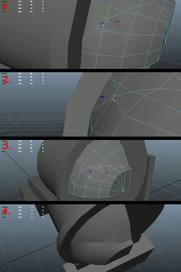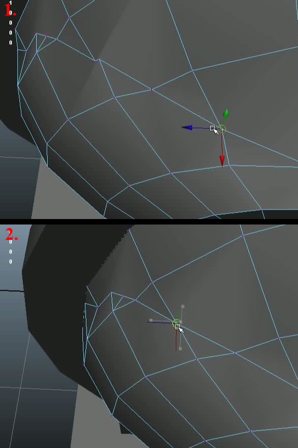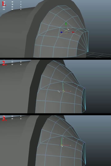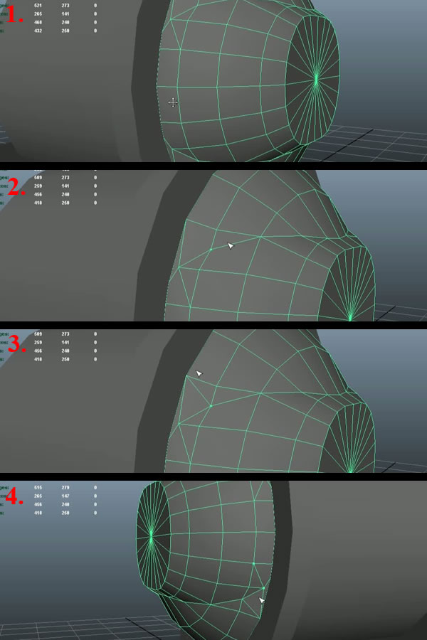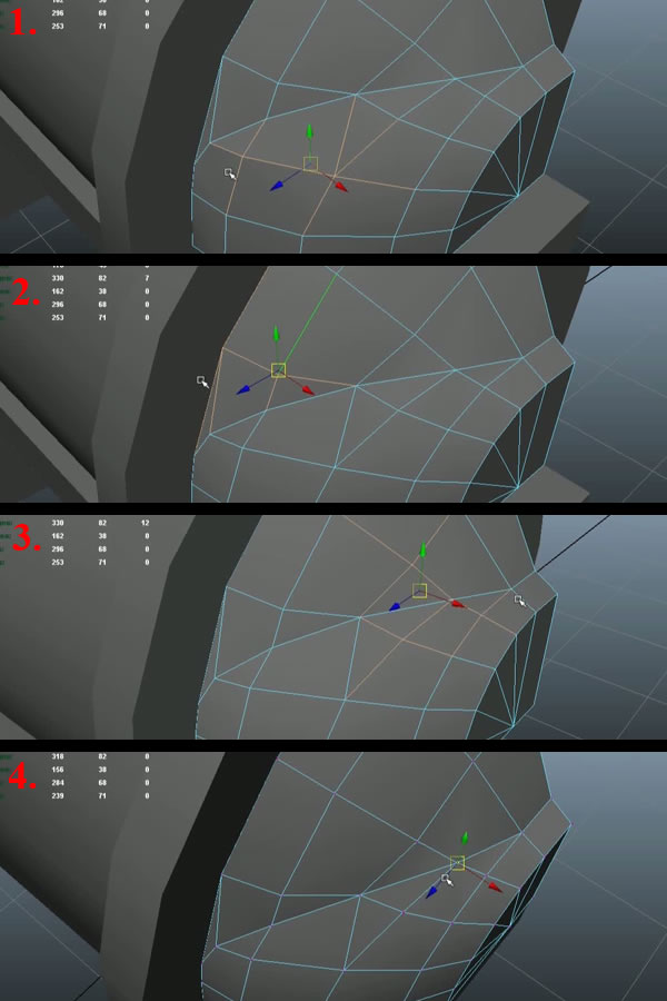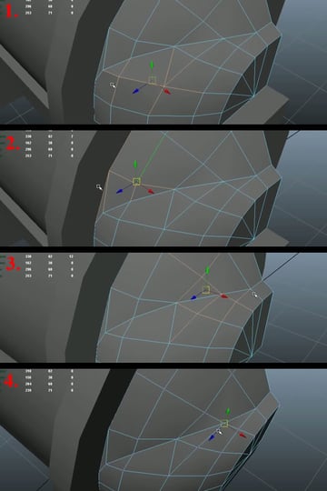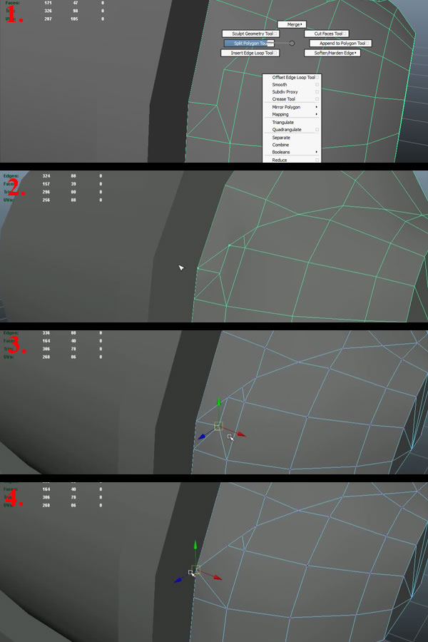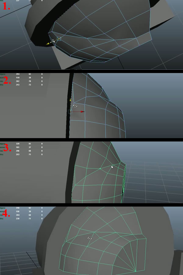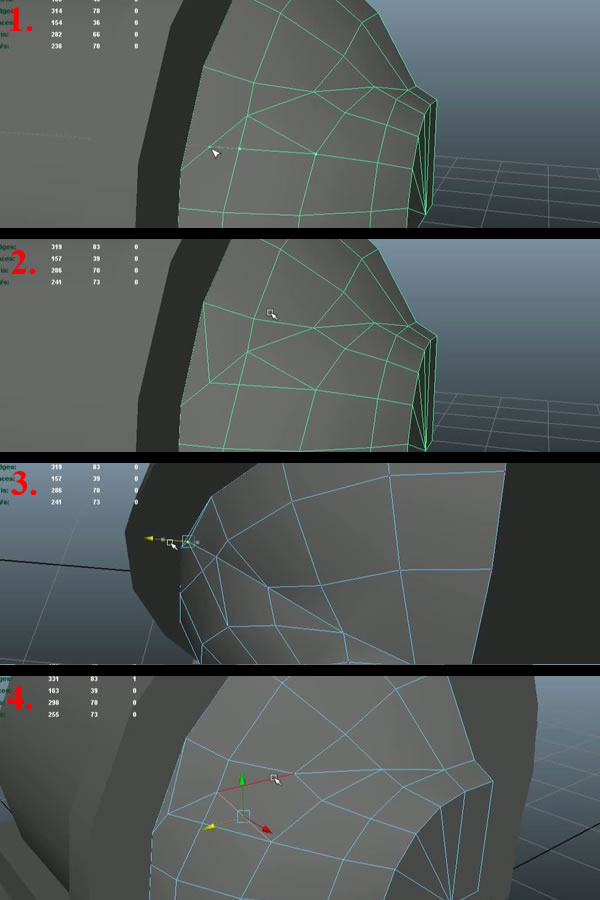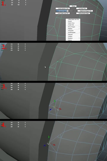 Now using the "Split Polygon Tool", create an edge loop connecting the open vertex to the upper vertex (1-2). Then move the shown vertex a little bit to the outside, so it can support the curvature of the edge loop (3). Then select the edge shown in last image and delete it (4).