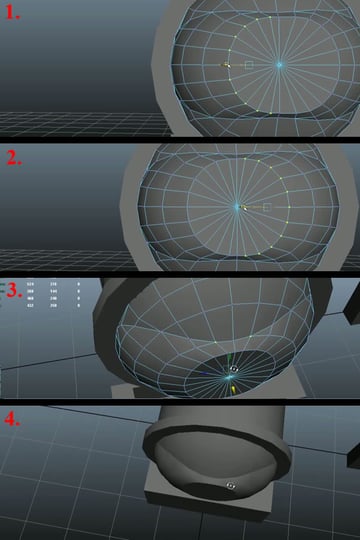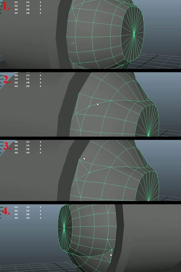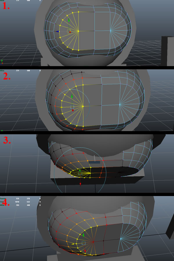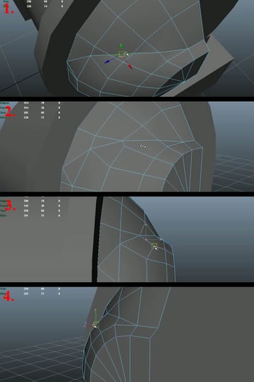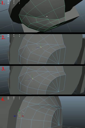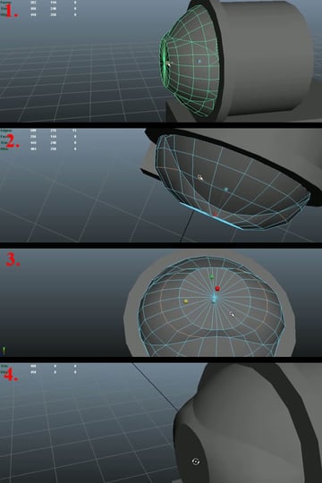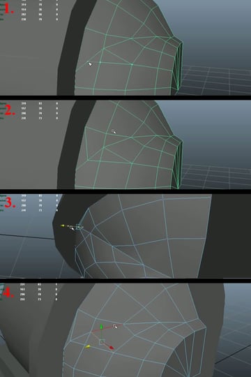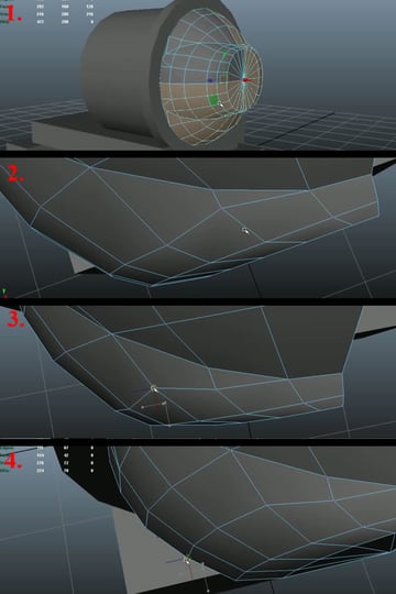 Now select three quarters of the mesh and delete it again (1). Select the vertices of the 3rd edge loop, and one by one, start pushing them back while maintaining the curvature and keeping an equal distance from both of the edge loops (2-4).