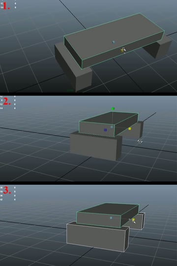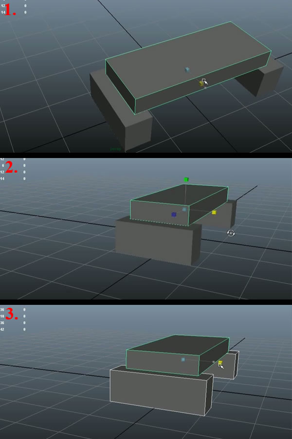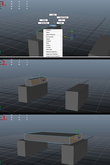 Now again duplicate the base cube and place it on top of the first. With it still selected, click and hold down the "Right Mouse Button" and in the pop up Options, select the "Face" option to enter into face selection mode (1). We can do just the same to go in any listed mode of any polygon shape. Then select the side face of the cube (2) and move it to the other side (3).