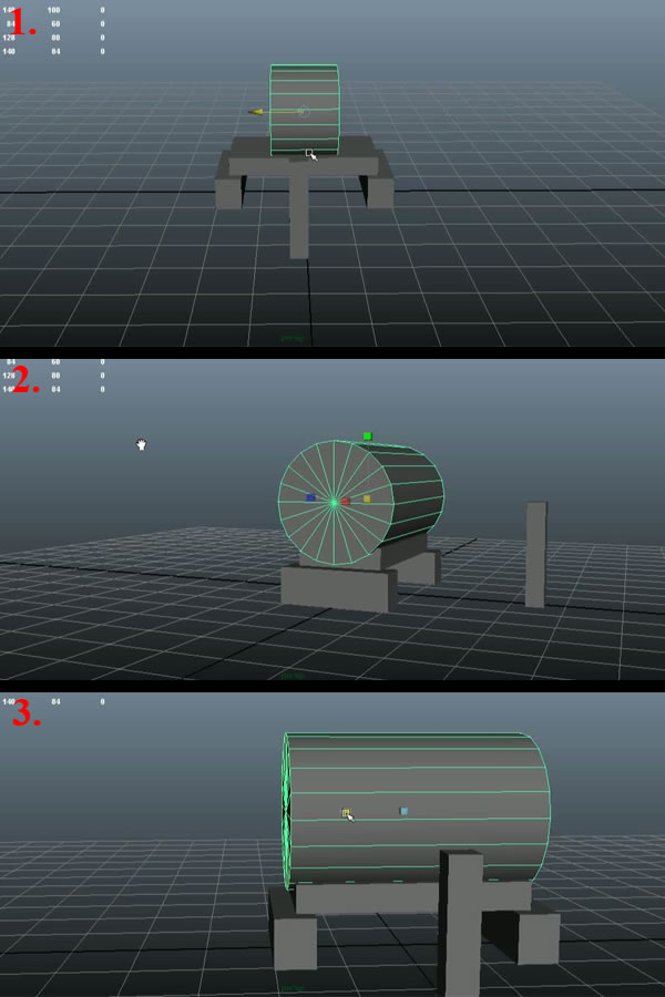 Now move the Sphere to right side of the Cylinder, and scale it up a bit (1). Then change it's pivot by pressing "D" + "V" and snap it to the side center vertex (2). Then snap the Sphere to the side vertex of the bigger Sphere. and scale it up a bit too (3).