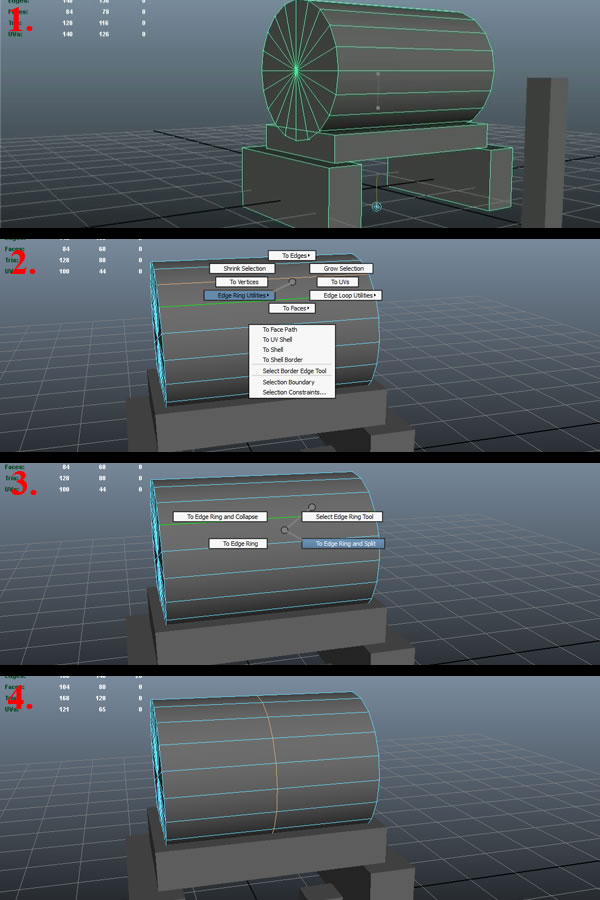 Now select all the meshes and press "Ctrl+G" to make a group of every selected mesh, and then snap align the pivot to the lower most vertex of the base cube (1). Next select the Cylinder and go to "Edge" mode by holding down the "Right Mouse Button" and selecting "Edge". Select any horizontal edge and press "Ctrl" and the "Right Mouse Button", hold and move over to "Edge Ring Utilities" (2). This will open another set of sub-options for it, and then move over to "Edge Ring and Split" (3) and then release the "Right Mouse Button". You'll notice a split edge loop exactly in the center of the edge ring (4).