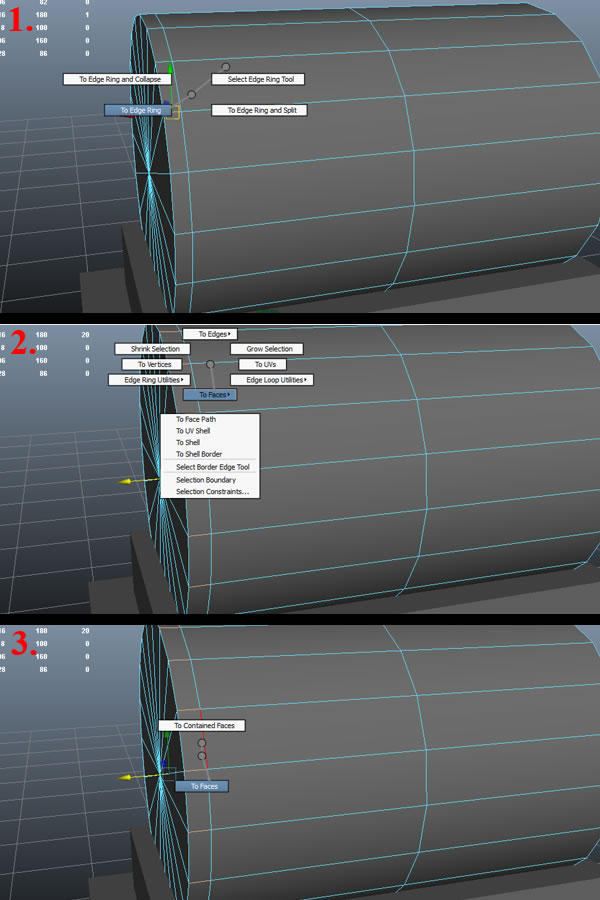 Now select any horizontal edge of the enclosed ring and using "Ctrl" while holding down the "Right Mouse Button", move over to "Edge Ring Utilities" (this will pop open another set of sub-options) move over to "To Edge Ring" (1) and release the "Right Mouse Button", this will only select the complete edge ring. Then with the same selection press "Ctrl" and hold down the "Right Mouse Button " and move over to "To Faces" (2) (while still holding the "Right Mouse Button"), and from the new pop up sub-options, move over to "To Faces" (3) again and release the "Right Mouse Button". And it will convert the selection of edge ring to faces.