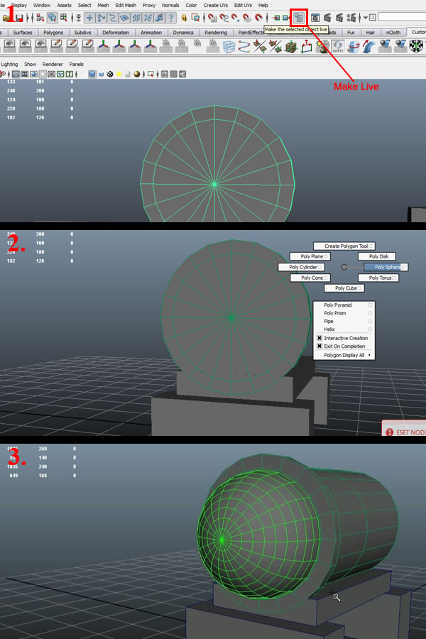 Now select the cylinder mesh and click on "Make Live" (1) and it will make the mesh "live" (this will allow you to draw any other mesh over it). Now again with nothing selected, press "Shift" and hold down the "Right Mouse Button" and select "Poly Sphere" (2), create the sphere over it by dragging with the "Left Mouse Button" (3).