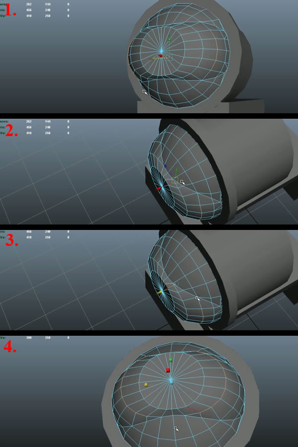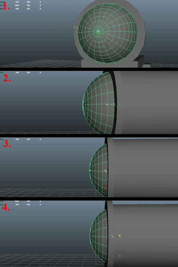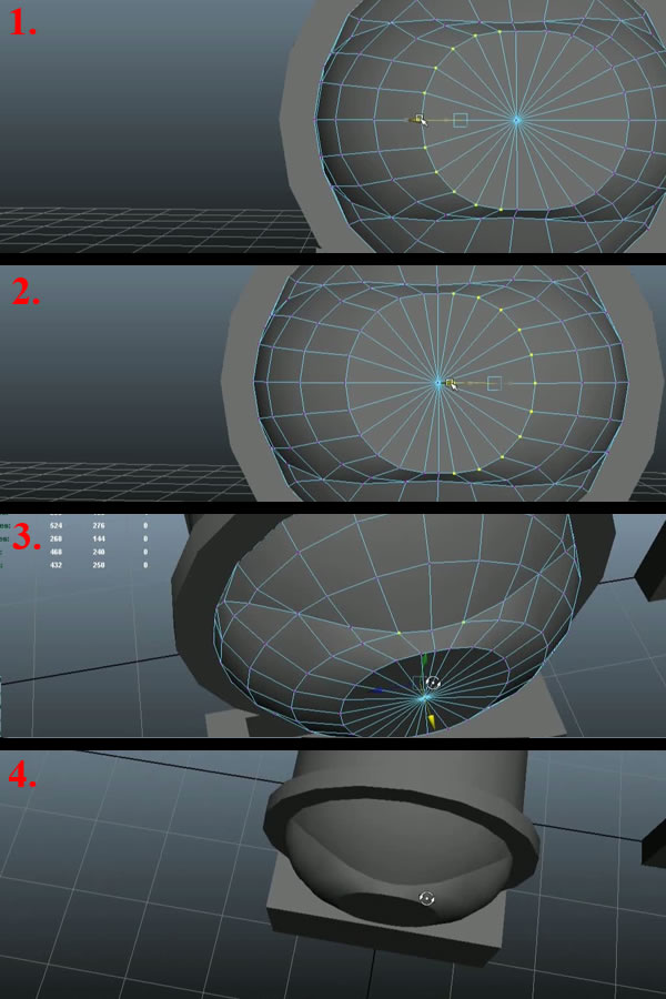 Now select the 2 upper most edge loops of the small Sphere by double clicking over any one edge, and do this again on the other edge while pressing "Shift" (1). While keeping the same selection, press "Shift+Right Mouse Button" and move over to "Delete Edge" (2) and it will delete these 2 edge loops. Now go to Vertex Selection Mode and select the center vertex (3), and by pressing "V", move it in "X-axis". Snap align it with the 2nd edge loop to make the surface flat (4).
