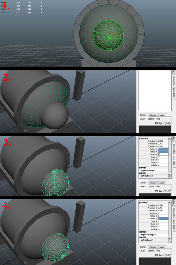 Now first deselect the Sphere by clicking anywhere in the viewport (except on any geometry) (1). And click "Make Live" again to undo the still "Live" Cylinder (2). Then again select the Cylinder and under "INPUTS", select the "pSphere2" and change all three "Rotation" values to 0 (3) , Then give it a value of 90 in "Rotation Z" (4).