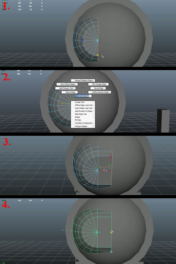 Now select the open edges of the right side (1) and press "Shift+Right Mouse Button" , hold and select "Extrude Edge"(2). Extrude the edges locally to the right in the "Z-Axis" (3). Snap align it with the Sphere's center by pressing "V" while moving. Finally change it's pivot to the center of the extruded surface by pressing "D"+"V" and moving the pivot towards the center vertex, by pressing the middle mouse button (4).
