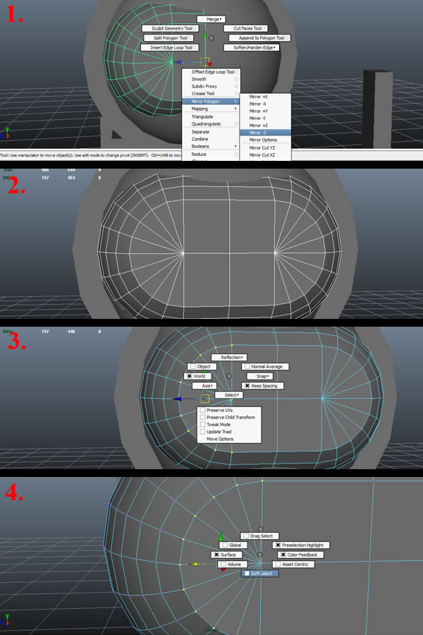 Now with the same Sphere selected, press "Shift+Right Mouse Button", hold and move to "Mirror Polygon". From the new options popup, select "Mirror -Z"(1), and it will mirror the whole object to the other side (2). Now select the loop of vertices on the left side (as shown) and press and hold "W+Left Mouse Button" to access the Move tool options (3). From it, move over "Select" and then to "Soft Select" (4).