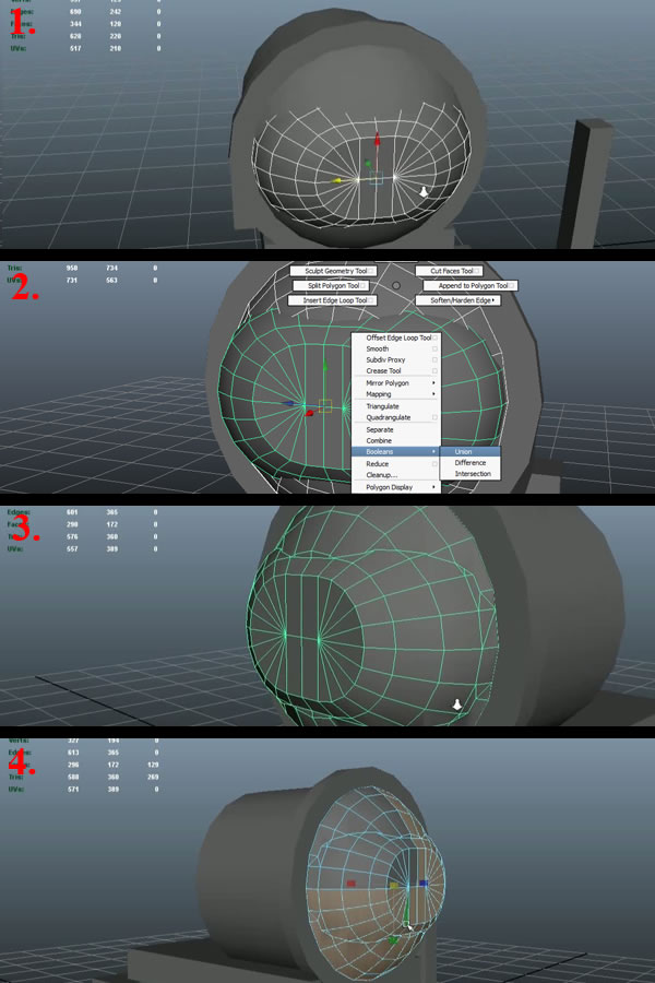 Now mirror the front mesh (just as we did earlier in Step 26). Then select the rear Sphere first and "Shift" select the mirrored geometry, press and hold "Shift+Right Mouse Button" and move over to "Booleans" (while still holding the "Right Mouse Button"). This will popup another set of sub-options, move over to "Union" and release the "Right Mouse Button" (2). This will merge the 2 selected meshes and create a new fused geometry, which you can see is pretty messy with how it merged all the edges (3), so we need to clean them up for sure, so select all the faces in "Face" selection mode and deselect the upper half quarter of the complete geometry (4), and delete it.