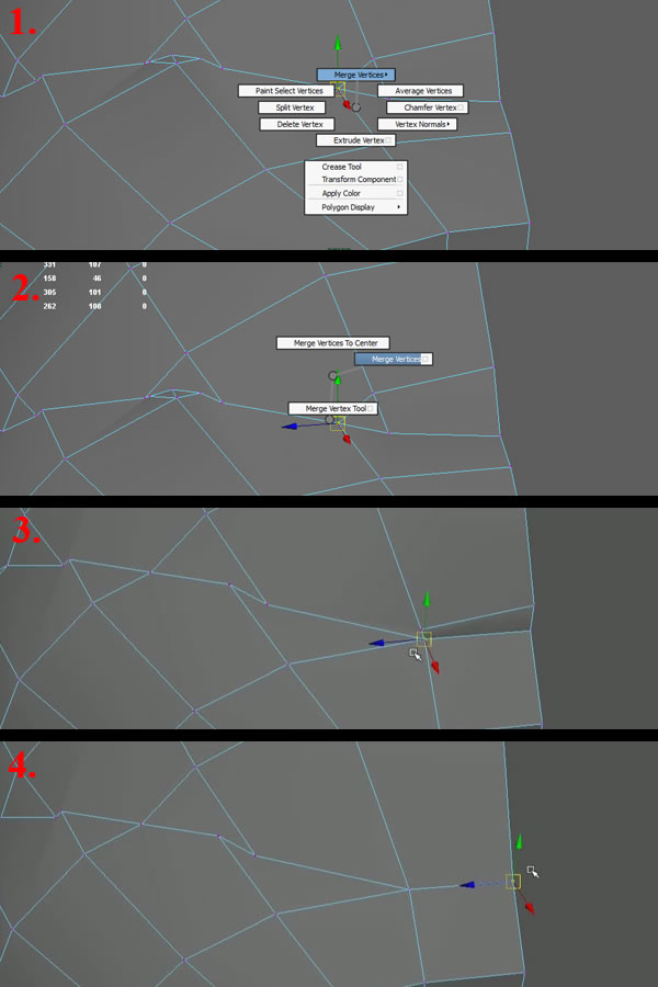 Now select all these snapped vertices and press and hold "Shift+Right Mouse Button " and move over to "Merge Vertices" (while still holding the "Right Mouse Button") (1), then move over to "Merge Vertices" again (2) and release the "Right Mouse Button". All 3 vertices will get merged into one vertex (3). Then using the same "snapping" and "merging" procedure, achieve the result shown in the last image (4).