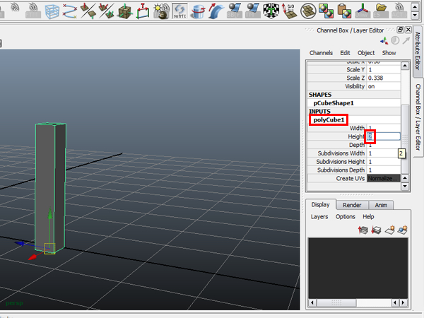 Now create another "Poly Cube" (the same way as before), and this time in the "Channel box" under "INPUTS" - "polycube1", change the Height to 2 and place it just above the grid. This cube is for visual reference only, and we can compare the other proportions to it.