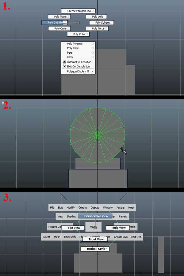 Now again with nothing selected, press "Shift+ Right Mouse Button", hold and select "Polygon Cylinder" (1). Click once to define the radius of the Cylinder, and then drag again to define the Cylinders Width (2). You won't be able to see it in the side view, so press and hold the "Spacebar" again, "Left Click" and hold to select the "Perspective View" (3).