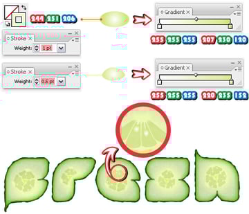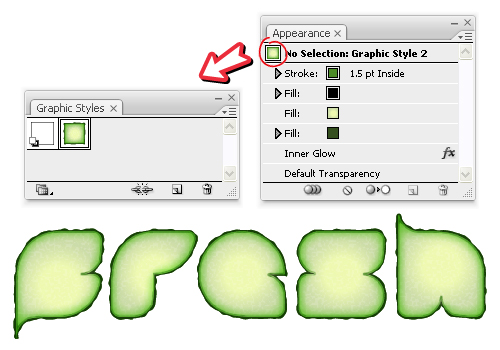 Now that you are done, make sure all the attributes are in the correct order then, having the circle selected, drag the thumbnail from the Appearance Panel into the Graphic Styles Panel to save the cucumber slice style. Next select all the letters and apply this style.